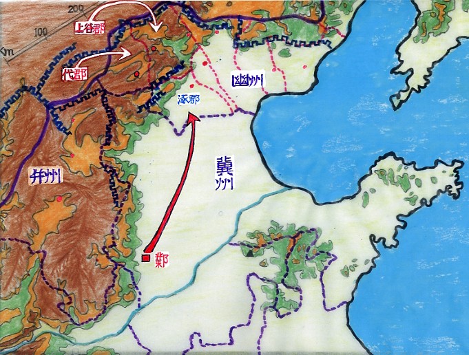 ちなみに、彼等の本拠地である代郡と上谷郡は、その全区域が南北2連ある長城に挟まれた山岳地帯である。逃走部隊は先ず手前の第1連の長城を越えて西にカーブし、「代郡」へと帰った。