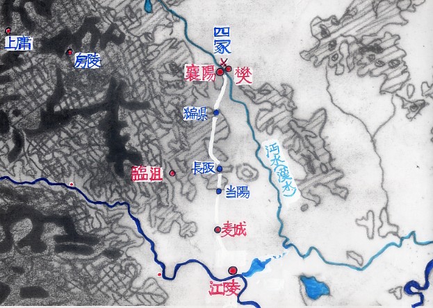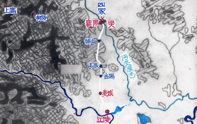 方針が決まった関羽軍は再び動き出した。同じ南進でも《水軍》を用いた漢水沿いの途も考えられたが7月に溯上して来た時とは状況が一変していた。魏の江夏郡太守を数十年に渡って務める討逆将軍・文聘ぶんぺいが漢水の中流域をガッチリ制圧してしまって居たのである。関羽軍は当初、輜重の搬送にも漢水を利用していたが現在ではすっかり制水権を奪われ、往来は止まった儘であった。そこで偵察の水軍を先遣させて試た処、その悉くを文聘に焼き討ちされてしまったのである。蓋し 水軍の危うさは、常に