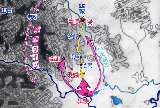 ※ 本文では、麦城の位置を、上図よりも大分、《南寄り=黄矢印の先端あたり》に想定してある。